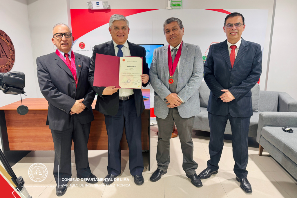 Al cierre de la sesión, el presidente del Capítulo de Ingeniería Electrónica, Ing. CIP Wilfredo Fanola, acompañado del secretario del capítulo, Ing. CIP Freddy Ortiz, hicieron entrega de un reconocimiento especial al distinguido ponente por su valiosa contribución al análisis técnico y estratégico en materia de defensa nacional.