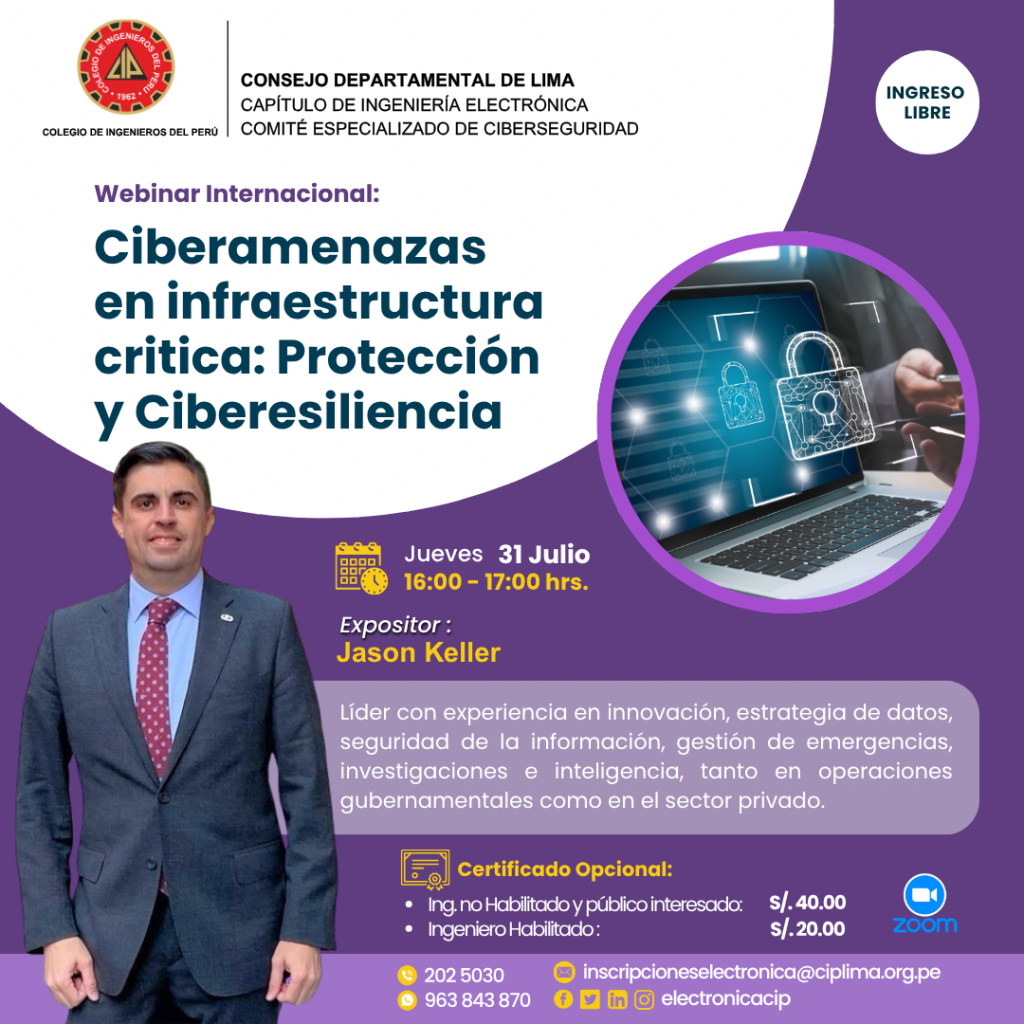 👋🏻 El Capítulo de Ingeniería Electrónica mediante su Comité Especializado de Ciberseguridad los invita a participar del Webinar Internacional: “Ciberamenazas en infraestructura critica: Protección y Ciberesiliencia”.
