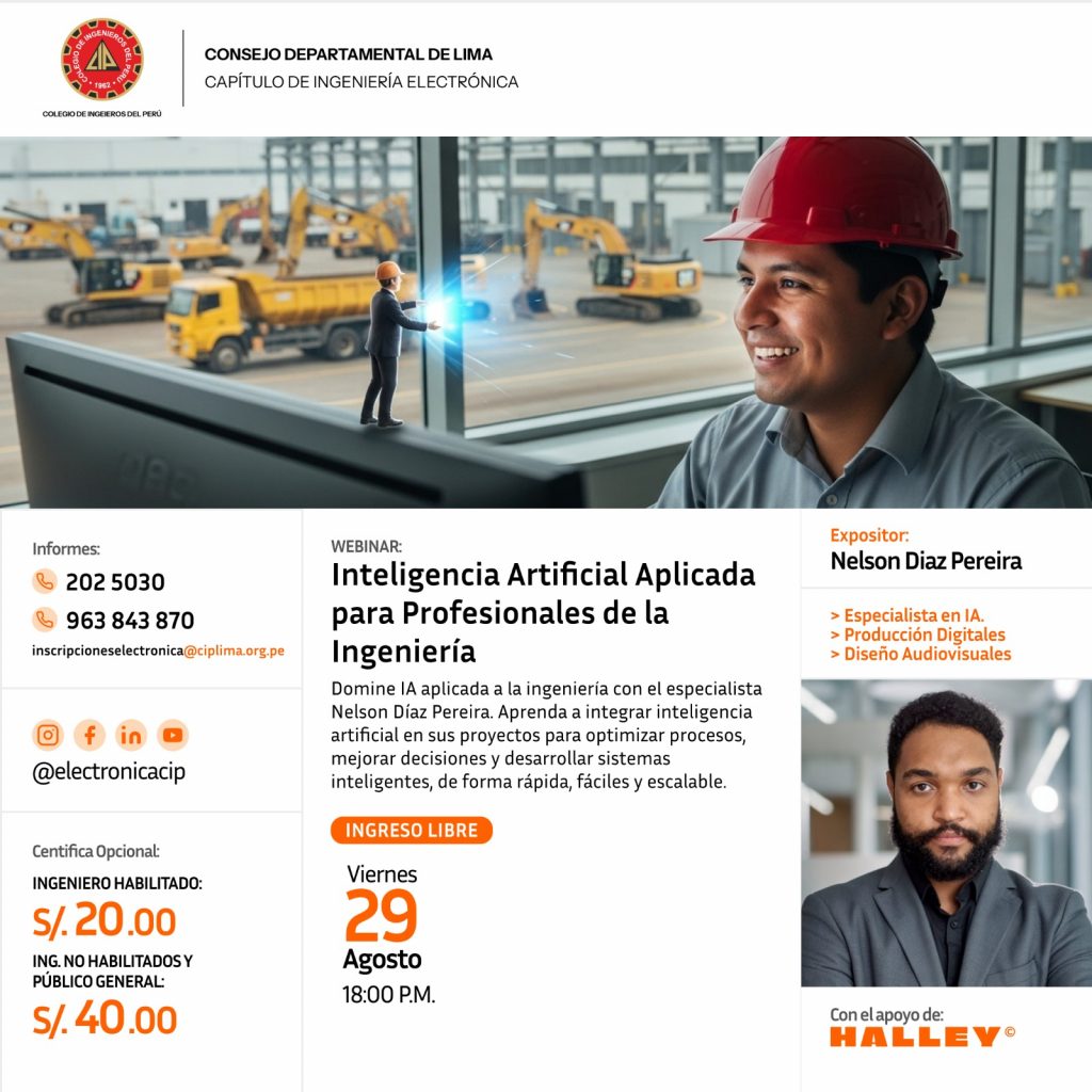 👋🏻 El Capítulo de Ingeniería Electrónica en colaboración con la empresa Halley los invita a participar del Webinar: «La Inteligencia Artificial aplicada para profesionales de la ingeniería».