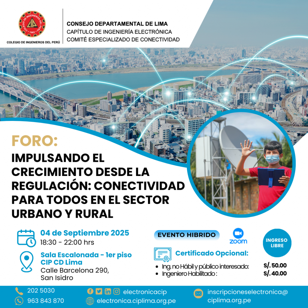👋🏻 El Capítulo de Ingeniería Electrónica a través de su Comité Especializado de Conectividad los invita a participar del Foro: “Impulsando el crecimiento desde la regulación: conectividad para todos en el sector urbano y rural”.