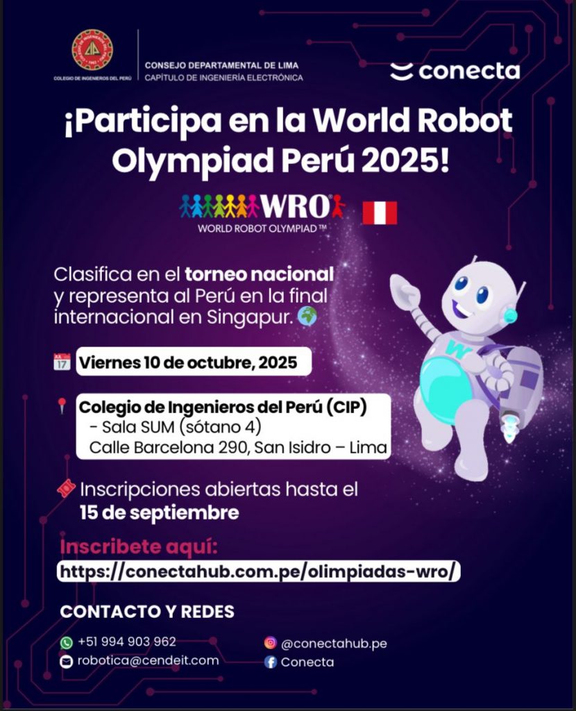 👋🏻 El Capítulo de Ingeniería Electrónica del CIP CD Lima , en colaboración con Conecta Hub , te invita a vivir la emoción de la robótica en la edición 2025 de la World Robot Olympiad .