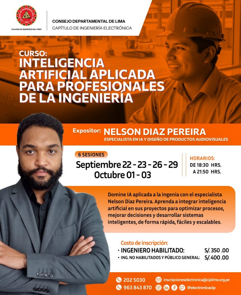 👋🏻 El Capítulo de Ingeniería Electrónica del CIP CD Lima, en colaboración con Halley los invita a participar del Curso: «La Inteligencia Artificial aplicada para profesionales de la ingeniería».