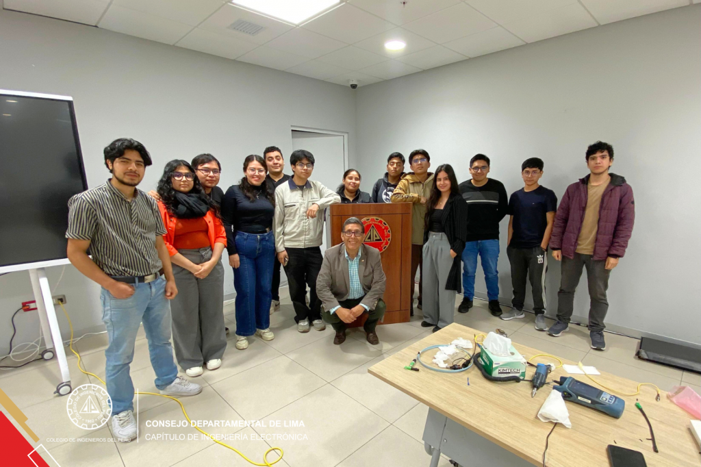 El taller, desarrollado en respuesta al interés de los propios estudiantes, estuvo a cargo del Ing. CIP Augusto Jáuregui L., Presidente del CTN 128 Telecomunicaciones del INACAL y Vicepresidente del Capítulo de Ing. Electrónica del CIP CD Lima, destacado especialista en telecomunicaciones, quien compartió su experiencia en medición y diagnóstico de redes de fibra óptica.