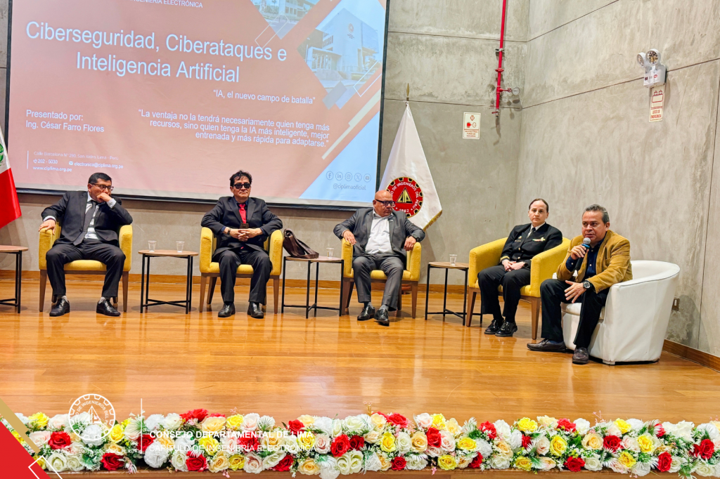 El panel reunió a especialistas como la Capitán de Corbeta Donna Silva Gurrionero (Marina de Guerra del Perú), Ing. CIP Elmer Astocóndor, Ing. CIP Julio Salgado, Ing. CIP César Farro, Mg. Herbert Galiano y Ing. David Carhuamaca, quienes discutieron sobre la protección de datos, resiliencia digital y los desafíos de la IA en ciberdefensa.