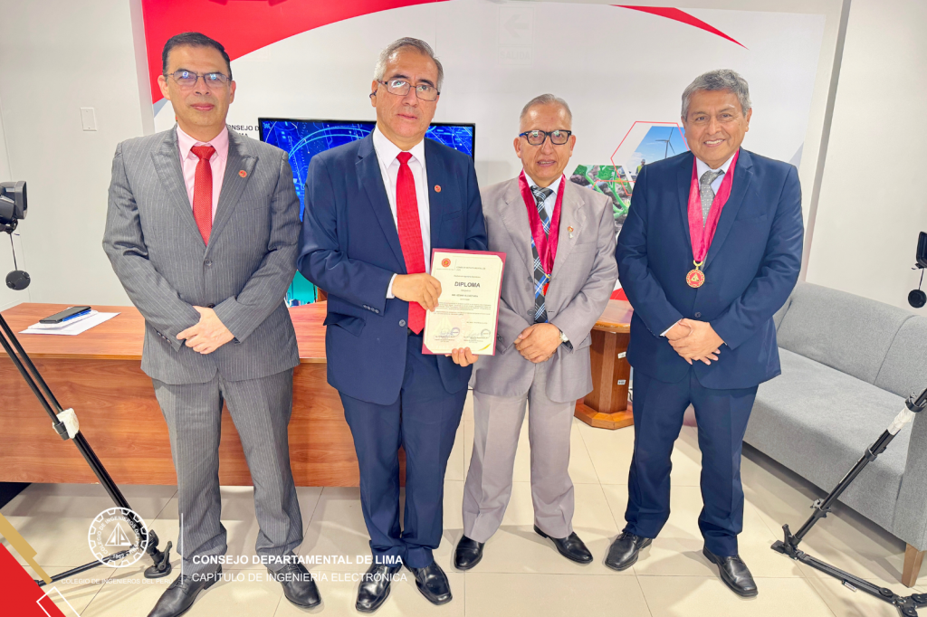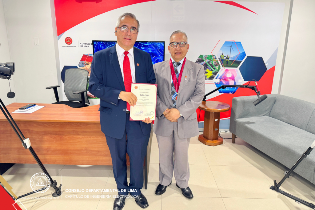 Al cierre del programa, se realizó un reconocimiento institucional al invitado, entregado por el Ing. CIP Wilfredo Fanola, presidente del Capítulo de Ingeniería Electrónica del CIP CD Lima, y por el Ing. CIP Freddy Ortiz, secretario del Capítulo, en mérito a su aporte al desarrollo del gobierno digital en el Perú.
