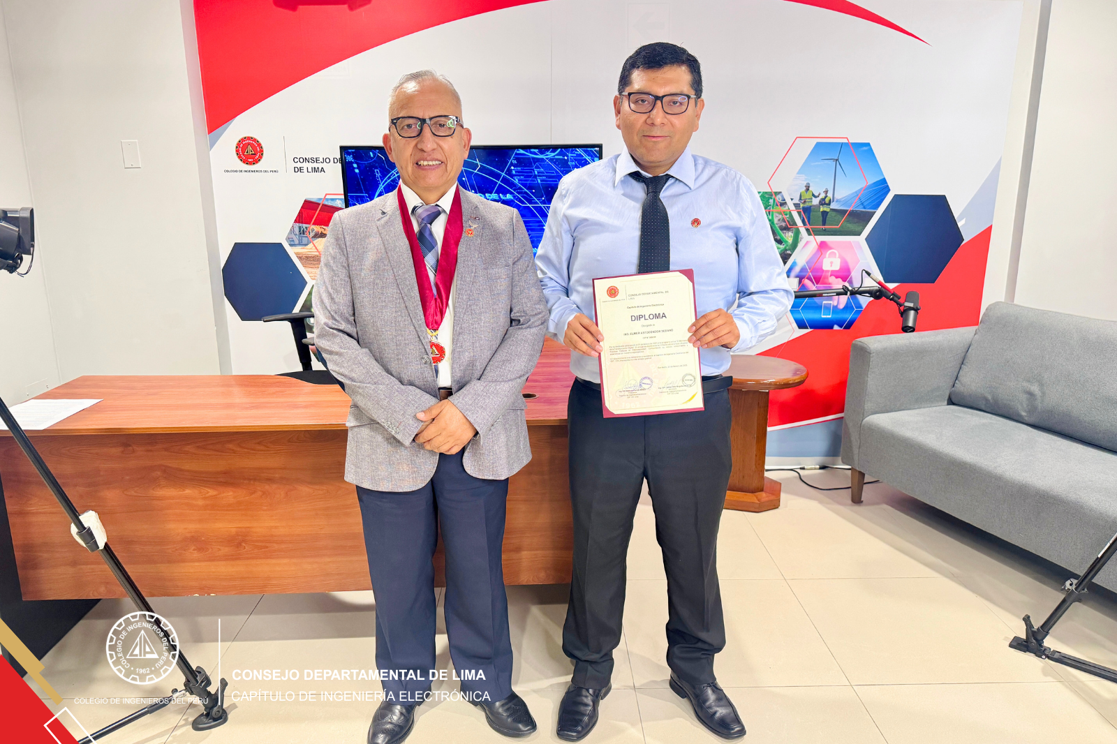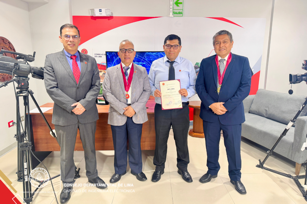 Al cierre del programa, se realizó un reconocimiento institucional al invitado, entregado por el Ing. CIP Wilfredo Fanola, presidente del Capítulo de Ingeniería Electrónica, y por el Ing. CIP Freddy Ortiz, secretario del Capítulo, en mérito a su contribución al fortalecimiento de la ciberseguridad en infraestructuras críticas.