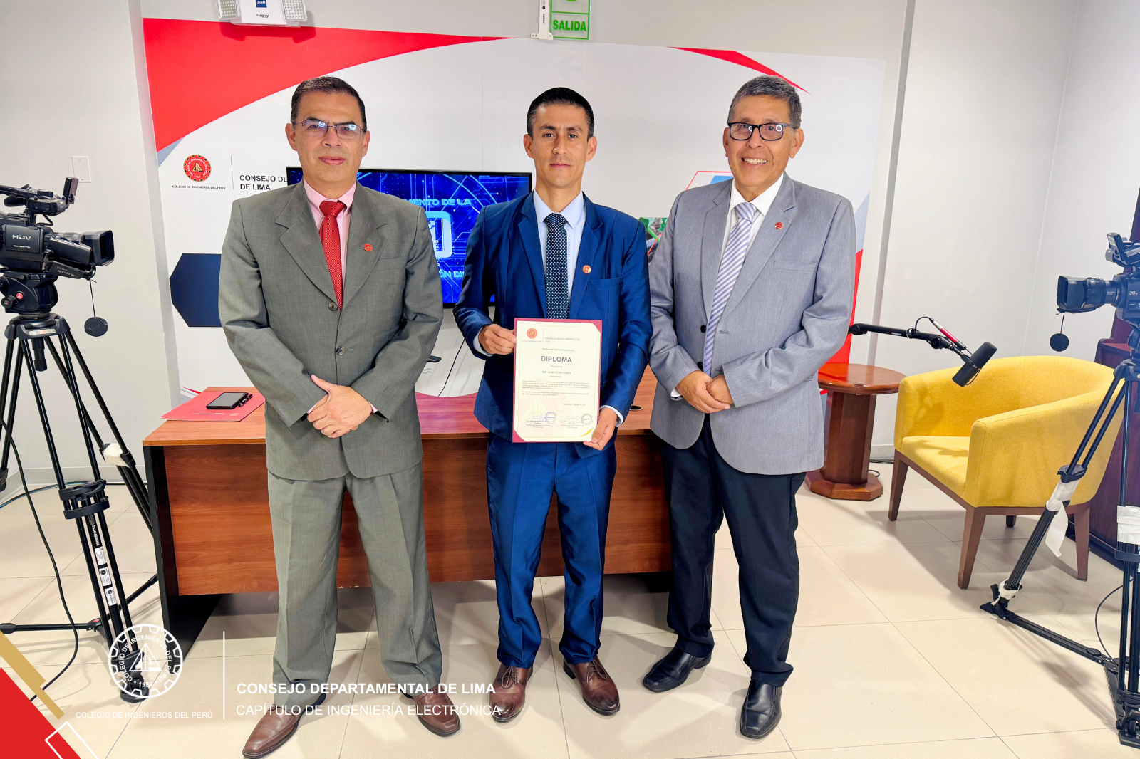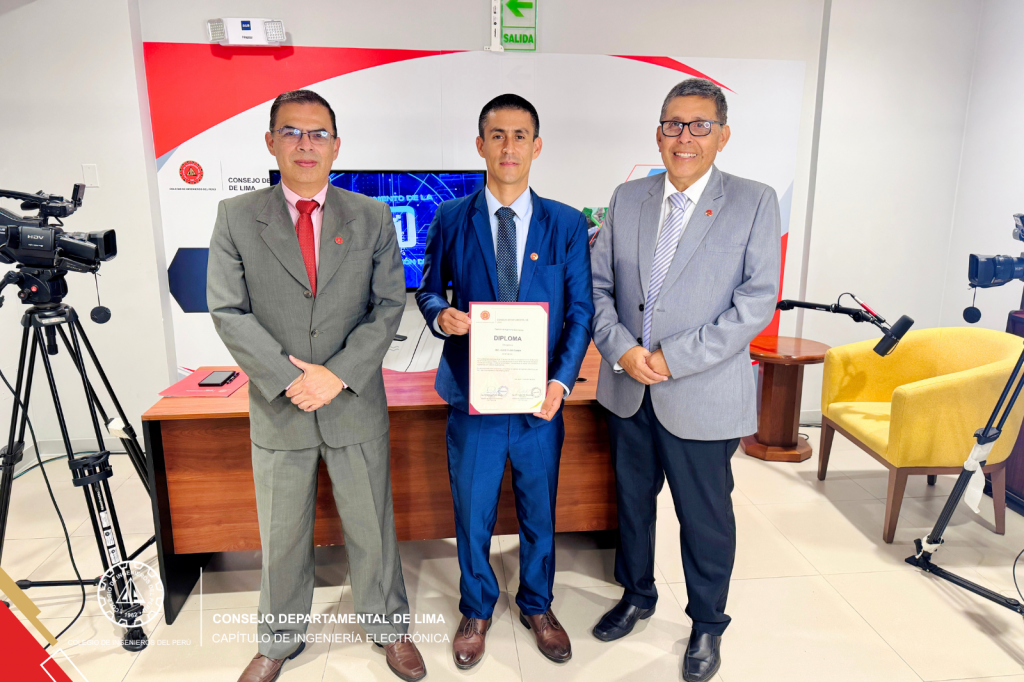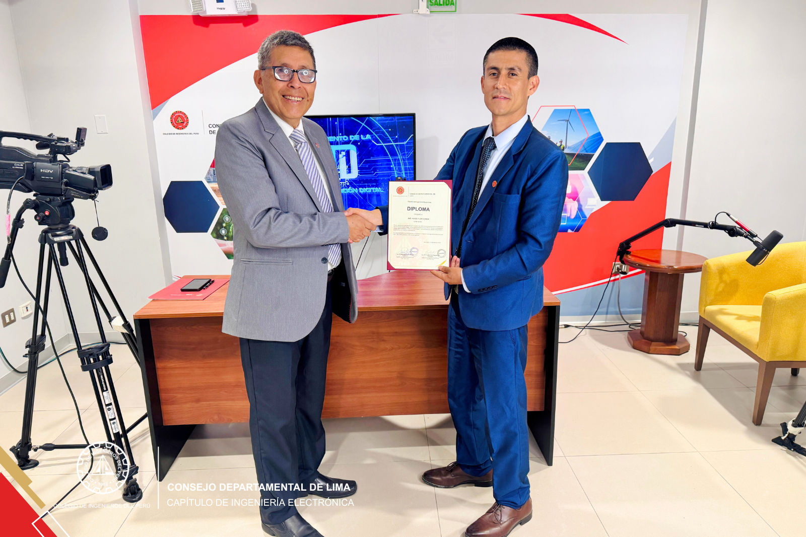 Al cierre del programa, se realizó un reconocimiento institucional al invitado, entregado por el Ing. CIP Augusto Jáuregui, vicepresidente del Capítulo de Ingeniería Electrónica del CIP CD Lima, en mérito a su aporte al fortalecimiento de la investigación y la innovación en el ámbito académico y profesional.